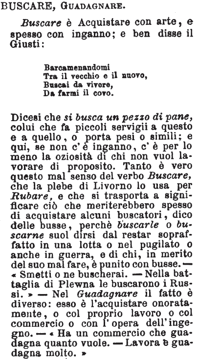 Dicesi che si busca un pezzo di pane, colui che fa piccoli servigii a questo e a quello, o porta pesi o simili; e qui, se non c'è inganno, c'è per lo meno la oziosità di chi non vuol lavorare di proposito. Tanto è vero questo mal senso del verbo Buscare, che la plebe di Livorno lo usa per Rubare, e che si trasporta a significare ciò che meriterebbero spesso di acquistare alcuni buscatori, dico delle busse, perchè buscarle o buscarne suol dirsi dal restar sopraffatto in una lotta o nel pugilato o anche in guerra, e di chi, in merito del suo mal fare, è punito con busse. - «Smetti o ne buscherai. - Nella battaglia di Plewna le buscarono i Russi.» - Nel Guadagnare il fatto è diverso: esso è l'acquistare onoratamente, o col proprio lavoro o col commercio o con l'opera dell'ingegno. - «Ha un commercio che guadagna quanto vuole. - Lavora e guadagna molto.» [immagine]