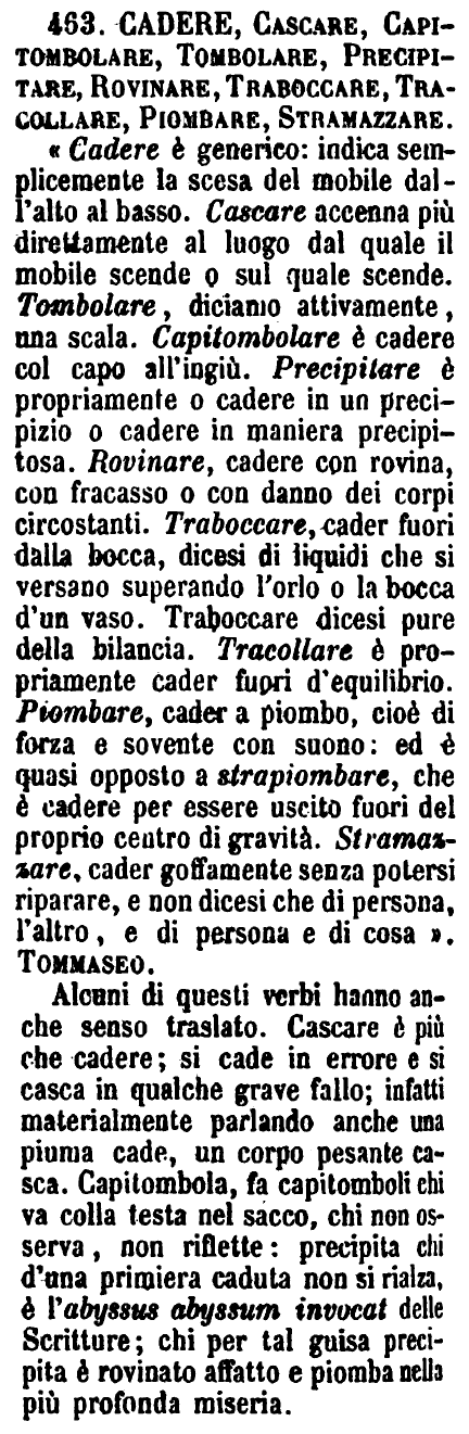 Alcuni di questi verbi hanno anche senso traslato. Cascare è più che cadere; si cade in errore e si casca in qualche grave fallo; infatti materialmente parlando anche una piuma cade, un corpo pesante casca. Capitombola, fa capitomboli chi va colla testa nel sacco, chi non osserva, non riflette: precipita chi d'una primiera caduta non si rialza, è l'abyssus abyssum invocat delle Scritture; chi per tal guisa precipita è rovinato affatto e piomba nella più profonda miseria. [immagine] |
