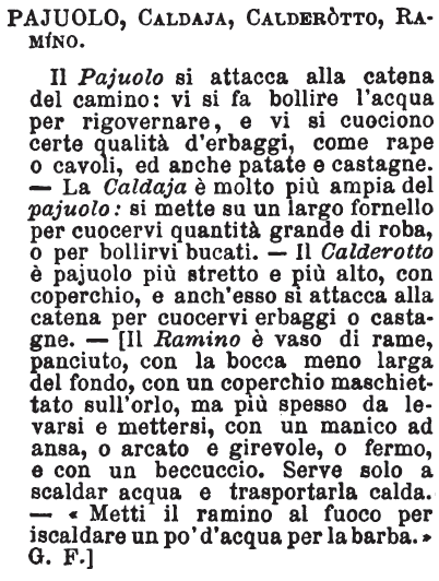 | Caldaia, Paiuolo, Calderotto, Calderone, Vagello, Vagellino - Il paiuolo è più piccolo della caldaia; ma hanno tutti e due la medesima forma, cioè larga e bassa: il calderotto è più piccolo ancora del paiuolo; ha piuttosto la forma d'una pentola, e un coperchio che chiude esattamente come coperchio di scatola. Calderone, grande caldaia.