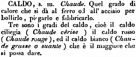 | Caldo - s. m. Chaude. Quel grado di calore che si dà al ferro od all'acciaio per bollirlo, piegarlo e fabbricarlo.