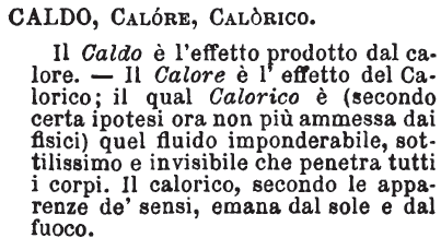| Caldo, Calore, Calorico - Il Caldo è l'effetto prodotto dal calore. - Il Calore è l'effetto del Calorico; il qual Calorico è (secondo certa ipotesi ora non più ammessa dai fisici) quel fluido imponderabile, sottilissimo e invisibile che penetra tutti i corpi. Il calorico, secondo le apparenze de' sensi, emana dal sole e dal fuoco. [immagine] |