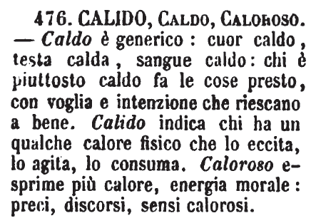 | Calido, Caldo, Caloroso - Caldo è generico: cuor caldo, testa calda, sangue caldo: chi è piuttosto caldo fa le cose presto, con voglia e intenzione che riescano a bene. Calido indica chi ha un qualche calore fisico che lo eccita, lo agita, lo consuma. Caloroso esprime più calore, energia morale: preci, discorsi, sensi calorosi. [immagine] |