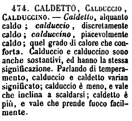 | Caldetto, Calduccio, Calduccino - Caldetto, alquanto caldo; calduccio, discretamente caldo; calduccino, piacevolmente caldo; quel grado di calore che conforta. Calduccio e calduccino sono anche sostantivi, ed hanno la stessa significazione. Parlando di temperamento, calduccio e caldetto varian significato; calduccio è meno, e vale che inclina a scaldarsi; caldetto è più, e vale che prende fuoco facilmente. [immagine] |