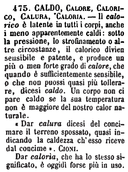 Caldo, Calore, Calorico, Calura, Caloria - Il calorico è latente in tutti i corpi, anche i meno apparentemente caldi: sotto la pressione, lo strofinamento o altre circostanze, il calorico divien sensibile e patente, e produce un più o men forte grado di calore, che quando è sufficientemente sensibile, o che non puossi quasi più tollerare, dicesi caldo. Un corpo non ci pare caldo se la sua temperatura non è maggiore del nostro calor naturale.
