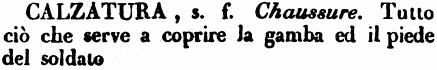 | Calzatura - s. f. Chaussure. Tutto ciò che serve a coprire la gamba ed il piede del soldato [immagine] |