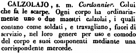 | Calzolajo - s. m. Cordonnier. Colui che fa le scarpe. Ogni corpo ha ordinariamente uno o due maestri calzolai, i quali contano come soldati, e travagliano, fuori di servizio, nel loro genere per uso e comodo del corpo e suoi componenti mediante una corrispondente mercede. [immagine] |