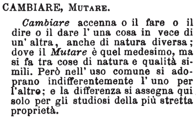 | Scambiare, Cambiare - Scambiare è Mettere una cosa o una persona nel luogo di un'altra, o il prendere l'una per l'altra. - Cambiare, che alcuni dicono Cangiare, è più propriamente il restar di usare una cosa per servirsi di un'altra, o per puro capriccio, o per altre ragioni. [immagine] |