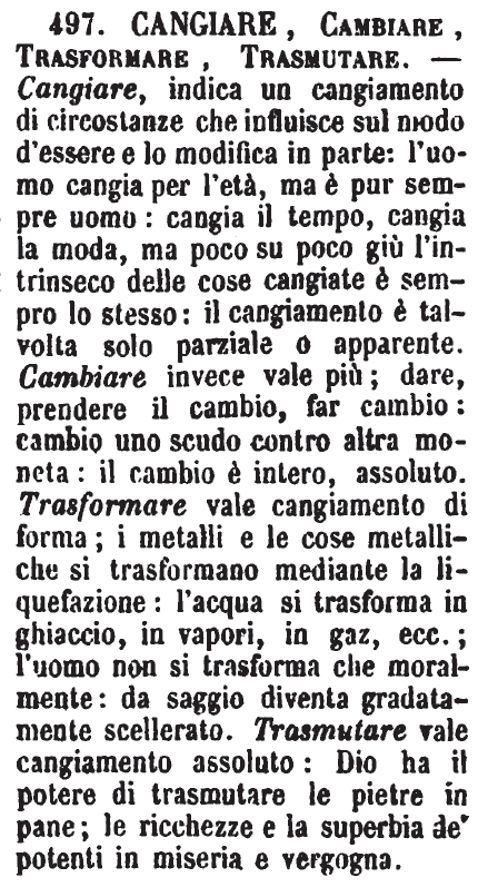 | Cangiare, Cambiare, Trasformare, Trasmutare - Cangiare, indica un cangiamento di circostanze che influisce sul modo d'essere e lo modifica in parte: l'uomo cangia per l'età, ma è pur sempre uomo: cangia il tempo, cangia la moda, ma poco su poco giù l'intrinseco delle cose cangiate è sempre lo stesso: il cangiamento è talvolta solo parziale o apparente. Cambiare invece vale più; dare, prendere il cambio, far cambio: cambio uno scudo contro altra moneta: il cambio è intero, assoluto. Trasformare vale cangiamento di forma; i metalli e le cose metalliche si trasformano mediante la liquefazione: l'acqua si trasforma in ghiaccio, in vapori, in gaz, ecc.; l'uomo non si trasforma che moralmente: da saggio diventa gradatamente scellerato: Trasmutare vale cangiamento assoluto: Dio ha il potere di trasmutare le pietre in pane; le ricchezze e la superbia de' potenti in miseria e vergogna. [immagine] |