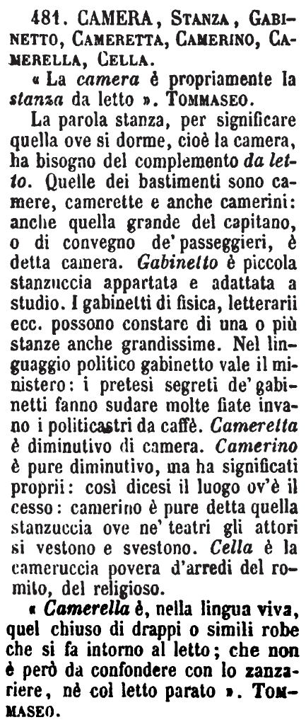 | Camera, Stanza, Gabinetto, Cameretta, Camerino, Camerella, Cella - «La camera è propriamente la stanza da letto». Tommaseo.