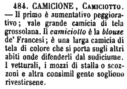 | Camicione, Camiciotto - Il primo è aumentativo peggiorativo; vale grande camicia di tela grossolana. Il camiciotto è la blouse de' Francesi; è una larga camicia di tela di colore che si porta sugli altri abiti onde difenderli dal sudiciume. I vetturali, i mozzi di stalla o scozzoni e altra consimil gente sogliono rivestirsene. [immagine] |