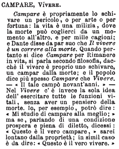 | Campare, Vivere - Campare è propriamente lo schivare un pericolo, o per arte o per fortuna: la vita è una milizia, dove la morte può coglierci da un momento all'altro, e per mille cagioni; e Dante disse da par suo che Il vivere è un correre alla morte. Quando pertanto si dice Campare per Rimanere in vita, si parla secondo filosofia, dacché il vivere è proprio uno schivare, un campar dalla morte; e il popolo dice più spesso Campare che Vivere. - «Il tale campò novant'anni.» - Nel Vivere c'è invece la sola idea dell'esercitare tutte le funzioni vitali, senza aver un pensiero della morte. Io, per esempio, potrò dire: «Mi studio di campare alla meglio;» ma se, parlando di una condizione prospera e piena di diletto, dicessi: «Questo è il vero campare,» sarei lontano dalla proprietà; in simil caso è da dire: «Questo è il vero vivere.» [immagine] |