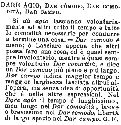 | Dare agio, Dare comodo, Dar comodità, Dar campo - Si dà agio lasciando volontariamente ad altri tutto il tempo e tutte le comodità necessarie per condurre a termine una cosa. - Dar comodo è meno; è Lasciare appena che altri possa fare una cosa, ed è quasi sempre involontario, mentre è quasi sempre volontario Dar comodità, e dice un Dar comodo più pieno e più largo. Dar campo indica maggior tempo e maggior larghezza lasciata altrui all'opera, ma senza idea di opportunità che è nelle altre espressioni. Nel Dare agio il tempo è lunghissimo, men lungo nel Dar comodità, breve o brevissimo nel Dar comodo, libertà di largo spazio nel Dar campo. G. F. [immagine] |