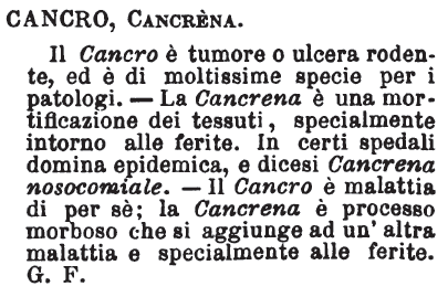 | Cancro, Cancrena - Il Cancro è tumore o ulcera rodente, ed è di moltissime specie per i patologi. - La Cancrena è una mortificazione dei tessuti, specialmente intorno alle ferite. In certi spedali domina epidemica, e dicesi Cancrena nosocomiale. - Il Cancro è malattia di per sè; la Cancrena è processo morboso che si aggiunge ad un'altra malattia e specialmente alle ferite. G. F. [immagine] |
