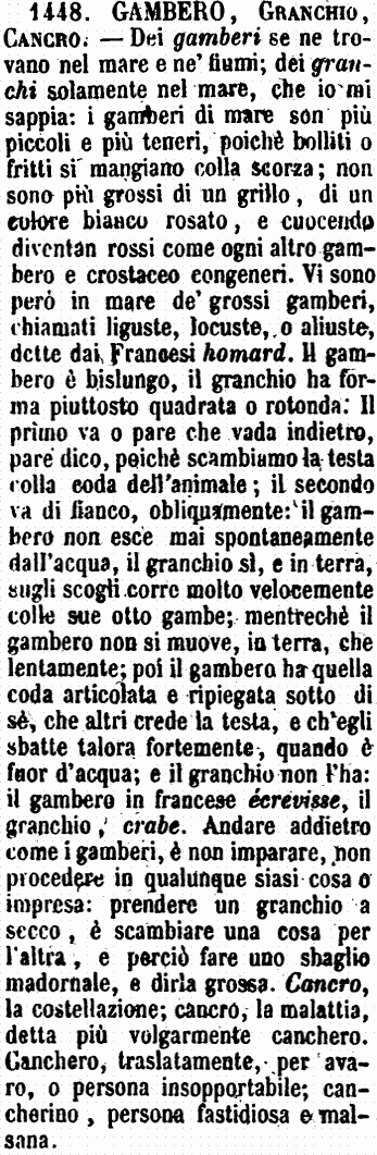 | Gambero, Granchio, Cancro - Dei gamberi se ne trovano nel mare e ne' fiumi; dei granchi solamente nel mare, che io mi sappia: i gamberi di mare son più piccoli e più teneri, poichè bolliti o fritti si mangiano colla scorza; non sono più grossi di un grillo, di un colore bianco rosato, e cuocendo diventan rossi come ogni altro gambero e crostaceo congeneri. Vi sono però in mare de' grossi gamberi, chiamati liguste, locuste, o aliuste, dette dai Francesi homard. Il gambero è bislungo, il granchio ha forma piuttosto quadrata o rotonda. Il primo va o pare che vada indietro, pare dico, poichè scambiamo la testa colla coda dell'animale; il secondo va di fianco, obliquamente: il gambero non esce mai spontaneamente dall'acqua, il granchio sì, e in terra, sugli scogli corre molto velocemente colle sue otto gambe; mentrechè il gambero non si muove, in terra, che lentamente; poi il gambero ha quella coda articolata e ripiegata sotto di sè, che altri crede la testa, e ch'egli sbatte talora fortemente, quando è fuor d'acqua; e il granchio non l'ha: il gambero in francese écrevisse, il granchio, crabe. Andare addietro come i gamberi, è non imparare, non procedere in qualunque siasi cosa o impresa: prendere un granchio a secco, è scambiare una cosa per l'altra, e perciò fare uno sbaglio madornale, e dirla grossa. Cancro, la costellazione; cancro, la malattia, detta più volgarmente canchero. Canchero, traslatamente, per avaro, o persona insopportabile; cancherino, persona fastidiosa e malsana. [immagine] |