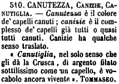| Canutezza, Canizie, Canutiglia - Canutezza è il colore de' capelli canuti; canizie è il complesso de' capelli già tutti o quasi tutti canuti. Canizie ha qualche senso traslato.
