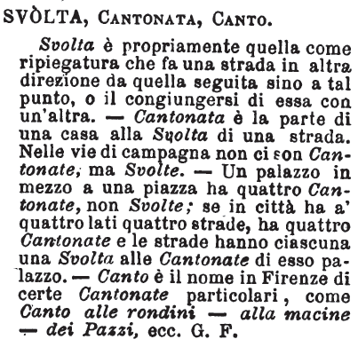 | Svolta, Cantonata, Canto - Svolta è propriamente quella come ripiegatura che fa una strada in altra direzione da quella seguita sino a tal punto, o il congiungersi di essa con un'altra. - Cantonata è la parte di una casa alla Svolta di una strada. Nelle vie di campagna non ci son Cantonate, ma Svolte. - Un palazzo in mezzo a una piazza ha quattro Cantonate, non Svolte; se in città ha a' quattro lati quattro strade, ha quattro Cantonate e le strade hanno ciascuna una Svolta alle Cantonate di esso palazzo. - Canto è il nome in Firenze di certe Cantonate particolari, come Canto alle rondini - alle macine - dei Pazzi, ecc. G. F. [immagine] |