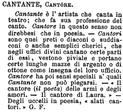| Cantante, Cantore - Cantante è l'artista che canta in teatro; che fa sua professione del canto. Cantore in questo senso non direbbesi che in poesia. - Cantori sono quei preti o diaconi o suddiaconi o anche semplici cherici, che negli uffici divini cantano certe parti di essi, vestono piviale e portano certe lunghe mazze di argento o di ottone come insegna del loro ufficio. Cantore ha poi sensi speciali a' quali Cantante non può piegarsi. - «Il cantore (il poeta) delle armi e degli amori. - Il cantore di Laura.» - Degli uccelli in poesia, «alati cantori.» G. F. [immagine] |