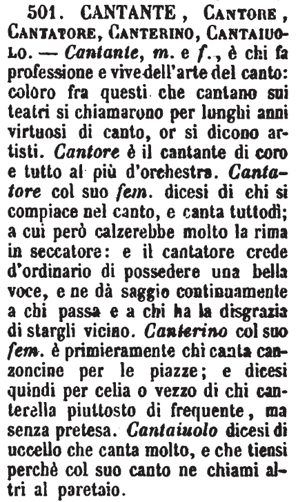 | Cantante, Cantore, Cantatore, Canterino, Cantaiuolo - Cantante, m. e f., è chi fa professione e vive dell'arte del canto: coloro fra questi che cantano sui teatri si chiamarono per lunghi anni virtuosi di canto, or si dicono artisti. Cantore è il cantante di coro e tutto al più d'orchestra. Cantatore col suo fem. dicesi di chi si compiace nel canto, e canta tuttodì; a cui però calzerebbe molto la rima in seccatore: e il cantatore crede d'ordinario di possedere una bella voce, e ne dà saggio continuamente a chi passa e a chi ha la disgrazia di stargli vicino. Canterino col suo fem. è primieramente chi canta canzoncine per le piazze; e dicesi quindi per celia o vezzo di chi canterella piuttosto di frequente, ma senza pretesa. Cantaiuolo dicesi di uccello che canta molto, e che tiensi perché col suo canto ne chiami altri al paretaio. [immagine] |