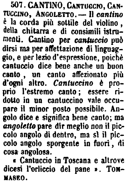 | Cantino, Cantuccio, Cantuccino, Angoletto - Il cantino è la corda più sottile del violino, della chitarra e di consimili istrumenti. Cantino per cantuccio può dirsi ma per affettazione di linguaggio, e per lezio d'espressione, poichè cantuccio dice bene anche un buon canto, un canto affezionato più d'ogni altro. Cantuccino è proprio l'estremo canto; essere ridotto in un cantuccino vale occupare il minor posto possibile. Angolo dice e significa bene canto; ma angoletto pare dir meglio non il piccolo angolo di dentro, ma sì il piccolo angolo sporgente in fuori, di cosa angolosa.