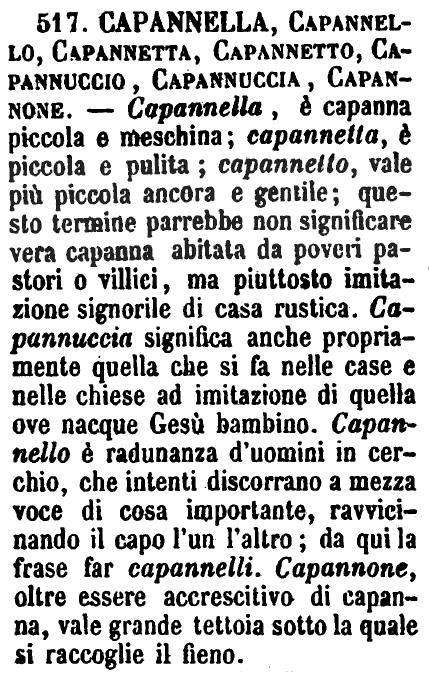 | Capannella, Capannello, Capannetta, Capannetto, Capannuccio, Capannuccia, Capannone - Capannella, è capanna piccola e meschina; capannetta, è piccola e pulita; capannetto, vale più piccola ancora e gentile; questo termine parrebbe non significare vera capanna abitata da poveri pastori o villici, ma piuttosto imitazione signorile di casa rustica. Capannuccia significa anche propriamente quella che si fa nelle case e nelle chiese ad imitazione di quella ove nacque Gesù bambino. Capannello è radunanza d'uomini in cerchio, che intenti discorrano a mezza voce di cosa importante, ravvicinando il capo l'un l'altro; da qui la frase far capannelli. Capannone, oltre essere accrescitivo di capanna, vale grande tettoia sotto la quale si raccoglie il fieno. [immagine] |