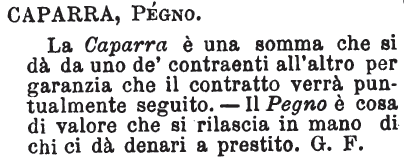 | Caparra, Pegno - La Caparra è una somma che si dà da uno de' contraenti all'altro per garanzia che il contratto verrà puntualmente seguito. - Il Pegno è cosa di valore che si rilascia in mano di chi ci dà denari a prestito. G. F. [immagine] |