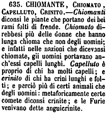 | Chiomato, Capelluto, Crinito - Il primo è proprio degli uomini, delle bestie, degli alberi, di stelle e di comete; il secondo solo degli uomini; il terzo è raro detto degli uomini, ed è più proprio degli animali, delle Furie e delle stelle. G. F. [immagine] |