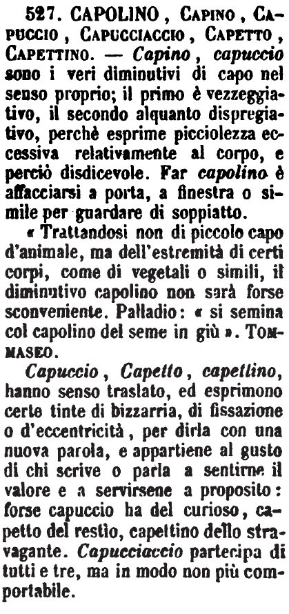 «Trattandosi non di piccolo capo d'animale, ma dell'estremità di certi corpi, come di vegetali o simili, il diminutivo capolino non sarà forse sconveniente. Palladio: «si semina col capolino del seme in giù». Tommaseo. Capuccio, Capetto, capettino, hanno senso traslato, ed esprimono certe tinte di bizzarria, di fissazione o d'eccentricità, per dirla con una nuova parola, e appartiene al gusto di chi scrive o parla a sentirne il valore e a servirsene a proposito: forse capuccio ha del curioso, capetto del restìo, capettino dello stravagante. Capucciaccio partecipa di tutti e tre, ma in modo non più comportabile. [immagine] |
