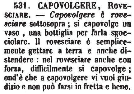 | Capovolgere, Rovesciare - Capovolgere è rovesciare sottosopra; si capovolge un vaso, una bottiglia per farla sgocciolare. Il rovesciare è semplicemente gettare a terra e anche distendere: nel rovesciare anche con forza, difficilmente si capovolge; ond'è che a capovolgere vi vuol giudizio e non può farsi in fretta e bene. [immagine] |
