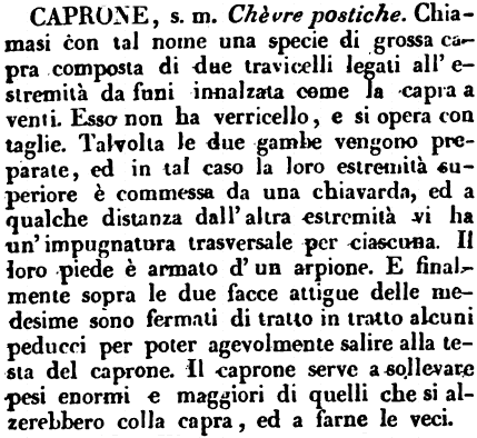 | Caprone - s. m. Chèvre postiche. Chiamasi con tal nome una specie di grossa capra composta di due travicelli legati all'estremità da funi innalzata come la capra a venti. Esso non ha verricello, e si opera con taglie. Talvolta le due gambe vengono preparate, ed in tal caso la loro estremità superiore è commessa da una chiavarda, ed a qualche distanza dall'altra estremità vi ha un'impugnatura trasversale per ciascuna. Il loro piede è armato d'un arpione. E finalmente sopra le due facce attigue delle medesime sono fermati di tratto in tratto alcuni peducci per poter agevolmente salire alla testa del caprone. Il caprone serve a sollevare pesi enormi e maggiori di quelli che si alzerebbero colla capra, ed a farne le veci. [immagine] |