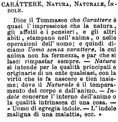 | Carattere, Natura, Naturale, Indole - Dice il Tommaseo che Carattere è quasi l'impressione che la natura, gli affetti e i pensieri, e gli altri abiti, stampano nell'anima, o nelle operazioni dell'uomo; e quindi diciamo Uomo senza carattere, la cui anima non ha fermezza, e par che si lasci rimpastar sempre. - Natura si intende per le qualità principali e originarie di un ente qualsiasi, con la virtù che le fa nascere e tien insieme; dove il Naturale è il temperamento del corpo e dell'animo. - Indole concerne l'interno dell'animo o la qualità intrinseca di una cosa. - «Uomo di egregia indole. - L'indole maligna di una malattia, ecc.» [immagine] |
