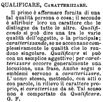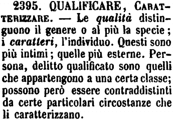 | Qualificare, Caratterizzare - Le qualità distinguono il genere o al più la specie; i caratteri, l'individuo. Questi sono più intimi; quelle più esterne. Persona, delitto qualificato sono quelli che appartengono a una certa classe; possono però essere contraddistinti da certe particolari circostanze che li caratterizzano. [immagine] |