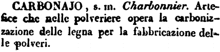 | Carbonajo - s. m. Charbonnier. Artefice che nelle polveriere opera la carbonizzazione delle legna per la fabbricazione delle polveri. [immagine] |