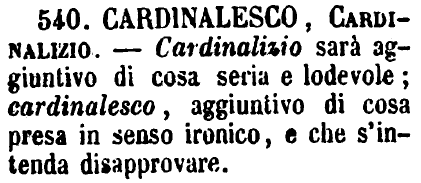 | Cardinalesco, Cardinalizio - Cardinalizio sarà aggiuntivo di cosa seria e lodevole; cardinalesco, aggiuntivo di cosa presa in senso ironico, e che s'intenda disapprovare. [immagine] |