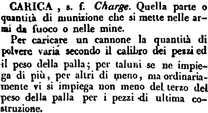 | Carica - s. f. Charge. L'urto o l'affrontamento d'un corpo di soldati, che si scaglia addosso ad un altro. La carica della cavalleria si dà colla sciabola in pugno rivolta colla punta al petto dell'avversario, e coi cavalli di tutta carriera, e quella della fanteria colla baionetta in resta, e di corsa. [immagine] |