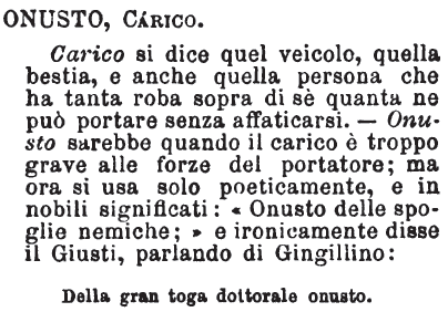 | Onusto, Carico - Il primo è della poesia; il secondo, della prosa più specialmente; onusto, onere, dicono carico e incarico più grave: carico è sostantivo e aggettivo; onusto aggettivo soltanto. [immagine] |