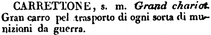 | Carrettone - s. m. Grand chariot. Gran carro pel trasporto di ogni sorta di munizioni da guerra. [immagine] |