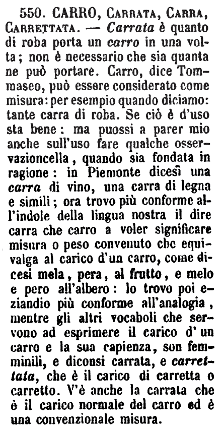 | Carro, Carrata, Carra, Carrettata - Carrata è quanto di roba porta un carro in una volta; non è necessario che sia quanta ne può portare. Carro, dice Tommaseo, può essere considerato come misura: per esempio quando diciamo: tante carra di roba. Se ciò è d'uso sta bene: ma puossi a parer mio anche sull'uso fare qualche osservazioncella, quando sia fondata in ragione: in Piemonte dicesi una carra di vino, una carra di legna e simili; ora trovo più conforme all'indole della lingua nostra il dire carra che carro a voler significare misura o peso convenuto che equivalga al carico d'un carro, come dicesi mela, pera, al frutto, e melo e pero all'albero: lo trovo poi eziandio più conforme all'analogia, mentre gli altri vocaboli che servono ad esprimere il carico d'un carro e la sua capienza, son femminili, e diconsi carrata, e carrettata, che è il carico di carretta o carretto. V'è anche la carrata che è il carico normale del carro ed è una convenzionale misura. [immagine] |