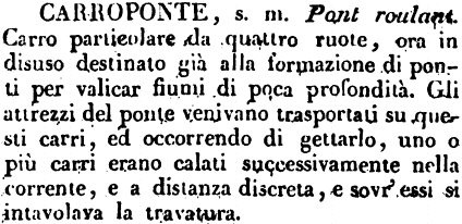 | Carroponte - s. m. Pont roulant. Carro particolare da quattro ruote, ora in disuso destinato già alla formazione di ponti per valicar fiumi di poca profondità. Gli attrezzi del ponte venivano trasportati su questi carri, ed occorrendo di gettarlo, uno o più carri erano calati successivamente nella corrente, e a distanza discreta, e sovr'essi si intavolava la travatura. [immagine] |