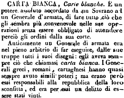| Carta bianca - Carte blanche. È un potere assoluto accordato da un Sovrano ad un Generale d'armata, di fare tutto ciò che gli sembra più convenevole nelle sue operazioni senza essere obbligato di attendere perciò gli ordini dalla sua corte.