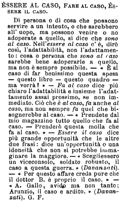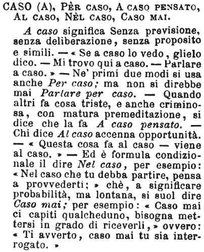| Caso, Per caso, A caso pensato, Al caso, Nel caso, Caso mai - A caso significa Senza previsione, senza deliberazione, senza proposito e simili. - «Se a caso lo vedo, glielo dico. - Mi trovo qui a caso. - Parlare a caso.» - Ne' primi due modi si usa anche Per caso; ma non si direbbe mai Parlare per caso. - Quando altri fa cosa triste, e anche criminosa, con matura premeditazione, si dice che la fa A caso pensato. - Chi dice Al caso accenna opportunità. - «Questa cosa fa al caso - viene al caso.» - Ed è formula condizionale il dire Nel caso, per esempio: «Nel caso che tu debba partire, pensa a provvederti;» chè, a significare probabilità, ma lontana, si suol dire Caso mai; per esempio: «Caso mai ci capiti qualcheduno, bisogna mettersi in grado di riceverli,» ovvero: «Ti avverto, caso mai tu sia interrogato.» [immagine] |