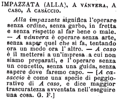 | Impazzata (alla), A vanvera, A caso, A casaccio - Alla impazzata significa l'operare senza ordine, senza garbo, in fretta e senza rispetto al far bene o male. - A vànvera è operare senza arte, senza saper quel che si fa, tentando ora un modo ora l'altro. - A caso è il mettersi a un'impresa a cui non siamo preparati, e l'operare senza un concetto, senza una guida, senza sapere dove faremo capo. - [A casaccio è come una specie di peggiorativo di A caso, e dice maggior trascuratezza avventata nell'eseguire una cosa. G. F.] [immagine] |