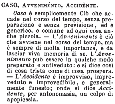 | Caso, Avvenimento, Accidente - Caso è semplicemente Ciò che accade nel corso del tempo, senza preparazione e senza previsione, ed è generico, e comune ad ogni cosa anche piccola. - L'Avvenimento è ciò che avviene nel corso del tempo, ma è sempre di molta importanza, e da lasciar viva memoria di sè. L'Avvenimento può essere in qualche modo preparato e antiveduto: e si dice così di cosa trista come di cosa prospera. - L'Accidente è improvviso, impreveduto e imprevedibile, e generalmente funesto; onde si dice Accidente, per antonomasia, un colpo di apoplessia. [immagine] |