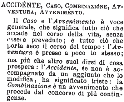 | Accidente, Caso, Combinazione, Avventura, Avvenimento - Il Caso e l'Avvenimento è voce generale, che significa tutto ciò che accade nel corso della vita, senza essere preveduto; è tutto ciò che porta seco il corso del tempo: l'Avventura è presso a poco lo stesso; ma più che altro suol dirsi di cosa prospera: l'Accidente, se non è accompagnato da un aggiunto che lo modifica, ha significato triste: la Combinazione è un avvenimento che procede dal concorso di più contingenze. [immagine] |