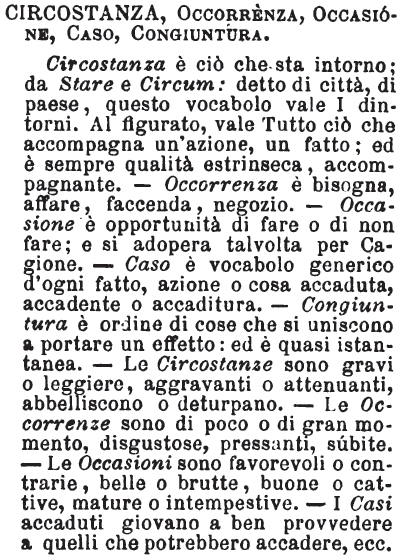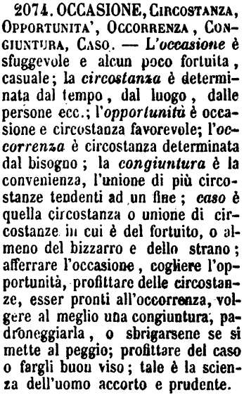 | Occasione, Circostanza, Opportunità, Occorrenza, Congiuntura, Caso - L'occasione è sfuggevole e alcun poco fortuita, casuale; la circostanza è determinata dal tempo, dal luogo, dalle persone ecc.; l'opportunità è occasione e circostanza favorevole; l'occorrenza è circostanza determinata dal bisogno; la congiuntura è la convenienza, l'unione di più circostanze tendenti ad un fine; caso è quella circostanza o unione di circostanze in cui è del fortuito, o almeno del bizzarro e dello strano; afferrare l'occasione, cogliere l'opportunità, profittare delle circostanze, esser pronti all'occorrenza, volgere al meglio una congiuntura, padroneggiarla, o sbrigarsene se si mette al peggio; profittare del caso o fargli buon viso; tale è la scienza dell'uomo accorto e prudente. [immagine] |