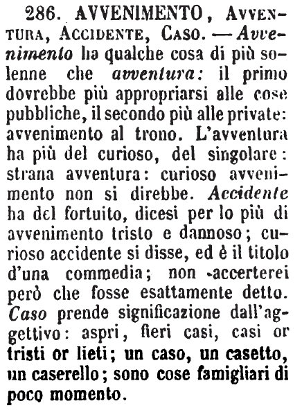 | Avvenimento, Avventura, Accidente, Caso - Avvenimento ha qualche cosa di più solenne che avventura: il primo dovrebbe più appropriarsi alle cose pubbliche, il secondo più alle private: avvenimento al trono. L'avventura ha più del curioso, del singolare: strana avventura: curioso avvenimento non si direbbe. Accidente ha del fortuito, dicesi per lo più di avvenimento tristo e dannoso; curioso accidente si disse, ed è il titolo d'una commedia; non accerterei però che fosse esattamente detto. Caso prende significazione dall'aggettivo: aspri, fieri casi, casi or tristi or lieti; un caso, un casetto, un caserello; sono cose famigliari di poco momento. [immagine] |