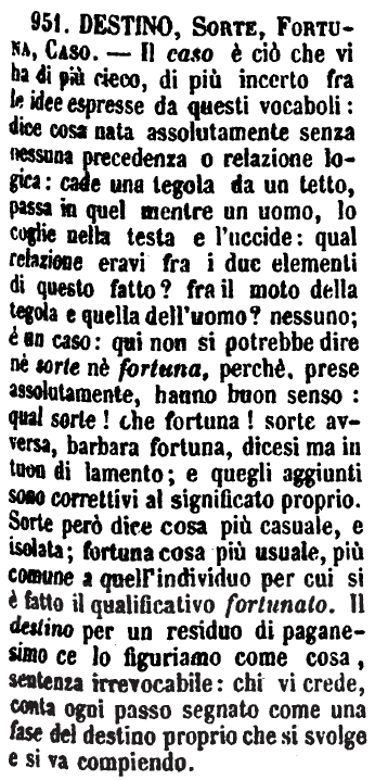 | Destino, Sorte, Fortuna, Caso - Il caso è ciò che vi ha di più cieco, di più incerto fra le idee espresse da questi vocaboli: dice cosa nata assolutamente senza nessuna precedenza o relazione logica: cade una tegola da un tetto, passa in quel mentre un uomo, lo coglie nella testa e l'uccide: qual relazione eravi fra i due elementi di questo fatto? fra il moto della tegola e quella dell'uomo? nessuno; è un caso: qui non si potrebbe dire nè sorte nè fortuna, perchè, prese assolutamente, hanno buon senso: qual sorte! che fortuna! sorte avversa, barbara fortuna, dicesi ma in tuon di lamento; e quegli aggiunti sono correttivi al significato proprio. Sorte però dice cosa più casuale, e isolata; fortuna cosa più usuale, più comune a quell'individuo per cui si è fatto il qualificativo fortunato. Il destino per un residuo di paganesimo ce lo figuriamo come cosa, sentenza irrevocabile: chi vi crede, conta ogni passo segnato come una fase del destino proprio che si svolge e si va compiendo. [immagine] |