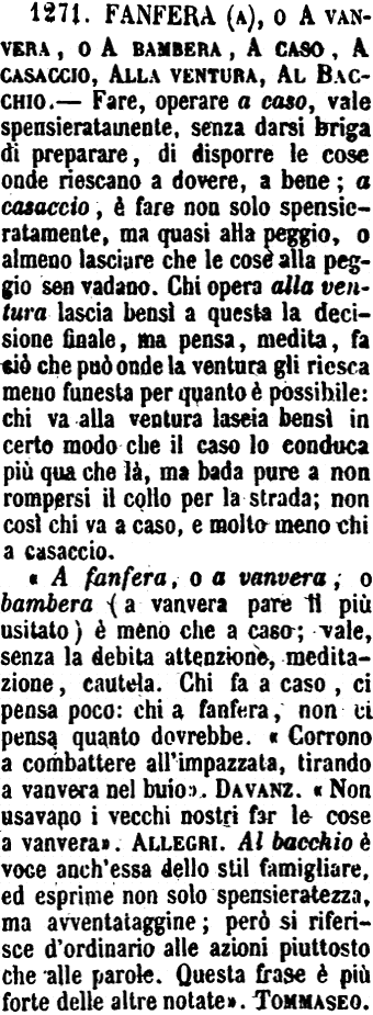 Fanfera (a), o A vanvera, o A bambera, A caso, A casaccio, Alla ventura, Al bacchio - Fare, operare a caso, vale spensieratamente, senza darsi briga di preparare, di disporre le cose onde riescano a dovere, a bene; a casaccio, è fare non solo spensieratamente, ma quasi alla peggio, o almeno lasciare che le cose alla peggio sen vadano. Chi opera alla ventura lascia bensì a questa la decisione finale, ma pensa, medita, fa ciò che può onde la ventura gli riesca meno funesta per quanto è possibile: chi va alla ventura lascia bensì in certo modo che il caso lo conduca più qua che là, ma bada pure a non rompersi il collo per la strada; non così chi va a caso, e molto meno chi a casaccio.