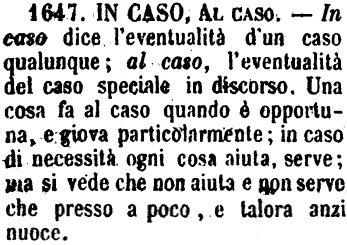 | In caso, Al caso - In caso dice l'eventualità d'un caso qualunque; al caso, l'eventualità del caso speciale in discorso. Una cosa fa al caso quando è opportuna, e giova particolarmente; in caso di necessità ogni cosa aiuta, serve; ma si vede che non aiuta e non serve che presso a poco, e talora anzi nuoce. [immagine] |