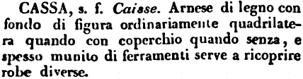 | Cassa - s. f. Caisse. Arnese di legno con fondo di figura ordinariamente quadrilatera quando con coperchio quando senza, e spesso munito di ferramenti serve a ricoprire robe diverse. [immagine] |