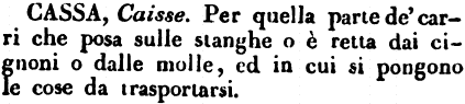 | Cassa - Caisse. Per quella parte de' carri che posa sulle stanghe o è retta dai cignoni o dalle molle, ed in cui si pongono le cose da trasportarsi. [immagine] |